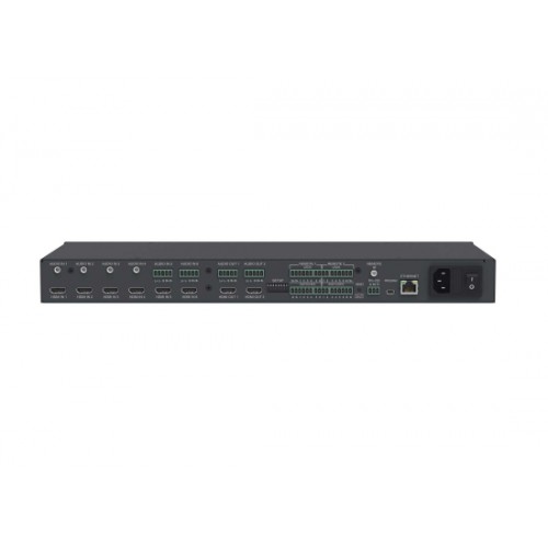- Eingänge: 6x HDMI, 4x 3,5 mm für unsymmetrisches Stereo-Audio, 2x 5-polige Schraubklemme für symmetrisches Stereo-Audio
