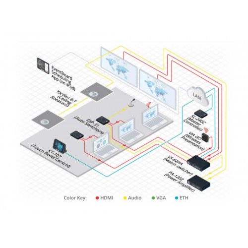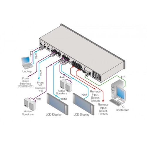 - Flexible Steuermöglichkeiten – Frontblende, IR–Fernbedienung (mitgeliefert), optionaler externer IR–Sensor, RS–232, Ethernet, Webserver und Kontaktschließung mit LED–Rückmeldung. Zusätzlich automatische Umschaltung und Step–In über HDMI–Umschaltung in Verbindung mit kompatiblen Geräten, zB SID–X3N und DIP–31. Kompatibel mit Kramer Protocol 3000