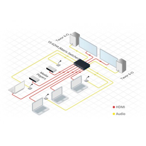 Der VS−62HA ist ein 6x2 Hochleistungs−Matrixschalter für 4K @60 Hz (4:2:0) HDMI− und Analogaudio−Signale. Du kannst die Signale neu takten und entzerren, sodass sie von jedem Eingang an einen beliebigen oder auch an beide Ausgänge gleichzeitig ausgegeben werden können.