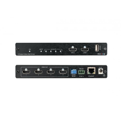 VW-4 ist ein Videowandtreiber mit 4 Ausgängen, der für die schnelle und einfache Konfiguration und Verwaltung von Videowänden entwickelt wurde. Verwende ein VW-4-Gerät, um eine beliebige Wandkonfiguration mit bis zu 4 Displays zu erstellen, z. B. eine 2x2, 4x1, 1x4, 2x1, 3x1-Videowand. Schließe weitere Geräte an, um Wände in beliebiger Größe und Konfiguration mit bis zu 64 Displays zu erstellen. Konfiguriere ein Einzel- oder Mehrgeräte-Setup mit der VW-4-App über Ethernet oder RS-232, oder konfiguriere schnell ein Basis-Setup mit den lokalen Dip-Schaltern.