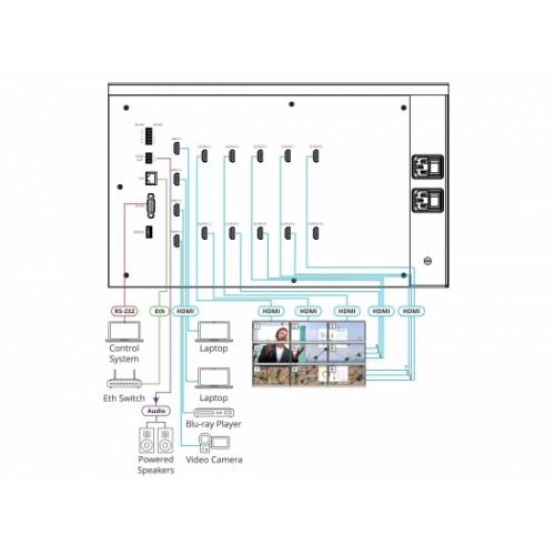 Der Kramer VW−9 HDMI 2.0 Multiview Videowand−Treiber ist ein Video−Prozessor der jüngsten Generation mit 4 Eingängen und 10 Ausgängen. Er bietet einen Videowand−Treiber mit Multiviewer−Funktionen, Skalierung, an die Anforderungen des Kunden angepasste Bildschirm−Layouts sowie schnelles Umschalten zwischen Eingängen mit klarem Video. Das Gerät unterstützt außerdem Audio−Umschaltung und bietet zusätzlich zu den HDMI Audio−Signalen einen analogen Audio−Ausgang. Eine intuitive Benutzeroberfläche per Browser, Steuerung über serielle Protokolle oder Ethernet sowie Bezel−Korrektur, Einstellungsmöglichkeiten zur Bildanpassung, HDCP− und EDID−Unterstützung gehören ebenfalls zu den von VW−9 unterstützten Funktionen.