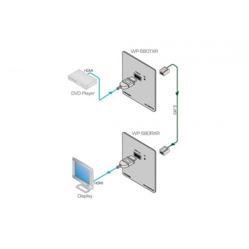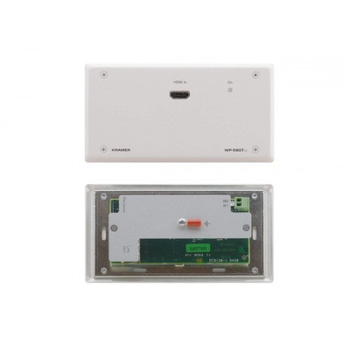 WP−580Txr ist ein Übertrager für 4K @60 Hz (4:2:0) HDMI−Signale mit RS−232 und IR über HDBaseT TP als aktives Wandanschlussfeld mit vergrößerter Reichweite. Er hat einen Eingang für HDMI−Signale und wandelt diese in ein HDBaseT Twisted Pair Signal für die Übertragung an den Empfänger WP−580Rxr. Als WP–580TXR(D) erhältlich für DECORA®−Rahmen.