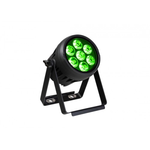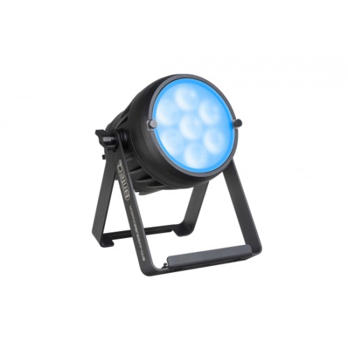 Kompakter, akkubetriebener IP65-Scheinwerfer mit 7 × 10 W RGBL-LEDs. Dank Doppelhalterung, Akku und integriertem Wireless-DMX eignet er sich als Batterie-Uplighter oder kompaktes LED-Par. Der Standard-Abstrahlwinkel von 14° (2420 Lux @ 5 m) lässt sich mit dem mitgelieferten Frostfilter anpassen.