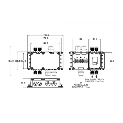 - „DMX“-Bereich mit 4 Dichtungsstutzen: DMX ein/Durchgang für das Haupt-DMX-Kabel und der DMX ein/aus Dichtungsstutzen zum/vom Projektor