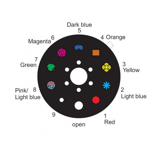 - Goborad mit statischen Gobos, 9 Farbgobos und offen