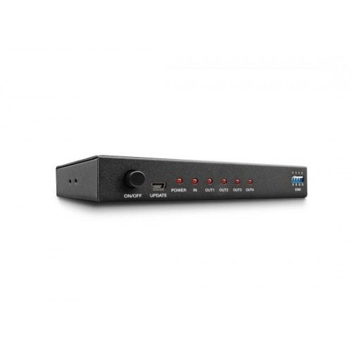 Dieser kompakte Splitter erlaubt den Anschluss einer HD-Signalquelle wie z.B. einer Set Top Box, eines Blu-ray- oder DVD-Players, einer Playstation oder X-Box oder PCs und gibt das Signal an vier HDMI- oder DVI-Displays, Beamer, etc. aus.