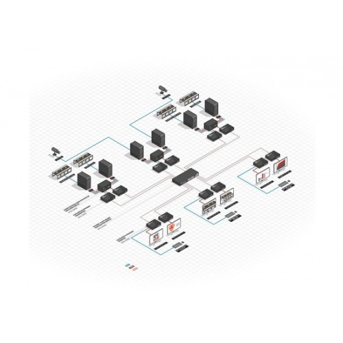 Dieses Extendersystem enthält ein komfortables IR-Verstärkersystem (25 - 56kHz) für die dedizierte Nutzung einer Fernbedienung von der Konsole aus. Es handelt sich um eine typische Lösung für Sicherheitssysteme (PVR Management oder Kontrollräume), ferngesteuerte Server-Administration (KVM) oder die Erweiterung von AV-Signalen via IP für großflächig verteiltes Monitoring industrieller Produktionsanlagen.