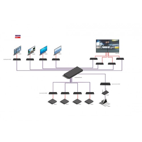 Eine HDMI-Quelle, z. B. ein PC oder Media Player, wird an ein einzelnes Encoder-Modul angeschlossen; ein HDMI-Display wird an ein einzelnes Decoder-Modul (Nr. 38397) angeschlossen. Mehrere Encoder und Decoder können für eine Vielzahl von Multicast-Verteilungsoptionen kombiniert werden. Das Controller-Modul verwaltet die gesamte Installation und leitet die verschiedenen Quellen an die verschiedenen Displays weiter, was ein Maximum an kreativer Freiheit und individuellen Anpassungsmöglichkeiten bietet. Alle Module können an einen Managed 1G-Switch angeschlossen werden, um ein Netzwerk von angeschlossenen Geräten zu schaffen.