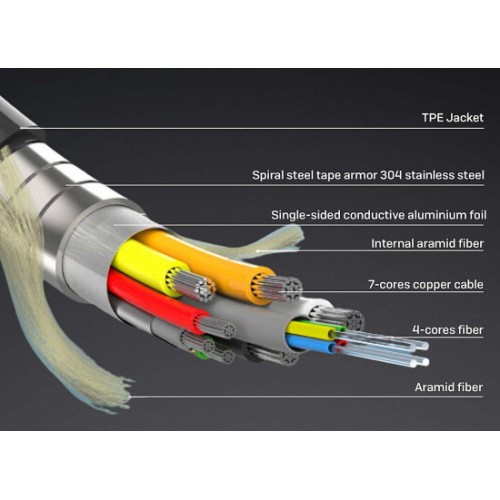 - Aramidfasern und zusätzlicher gepanzerter Stahlspiralmantel für eine robuste und widerstandsfähige Kabelstruktur