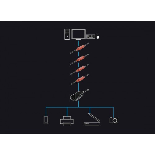 Die 8m und 12m Aktivverlängerungen sowie die 8m und 12m Aktivverlängerungs-Hubs verfügen über ein aktives Repeater-Modul, das das USB-Signal verstärkt. Die 30m Aktivverlängerung verwendet zwei dieser Repeater. Ein komplettes System ist auf eine maximale Länge von 60m und 4 Repeater-Module beschränkt. Jede Kombination aus Kabeln und einem Hub ist in diesem Rahmen möglich. Der Aktivverlängerungs-Hub muss immer als letztes Segment im System angeschlossen werden.