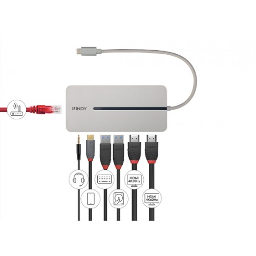 - Schnittstelle: USB Typ C an 2x HDMI / 2x USB Typ A / 1x USB Typ C / 1x RJ45 / 1x Audio 3.5mm