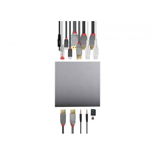 - Schnittstelle: USB Typ C an 3x USB 3.0 Typ A / 2x USB 2.0 Typ A / 1x USB 3.0 Typ C / 1x RJ45 / 2x HDMI / 1x DisplayPort / 1x SD-Slot & 1x MicroSD-Slot/ 2x 3.5mm Audio