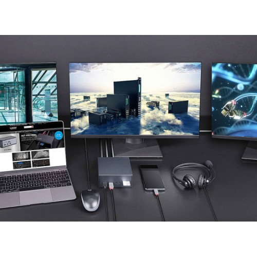 Die Dockingstation ist mit HDMI- und DisplayPort-Anschlüssen ausgestattet, die alle 4K-fähig sind. Bei Anschluss eines einzelnen Bildschirmes wird Ultra HD mit 4K@60Hz übertragen. Das Produkt unterstützt ferner 2560x1440 60Hz für Dual-Display-Szenarien und 1920x1080 60Hz für Triple-Display-Setups.