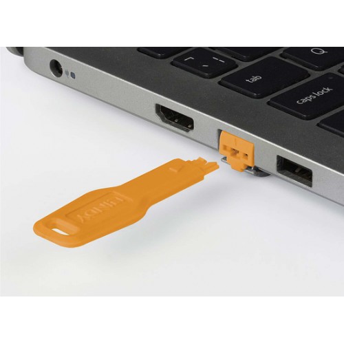 Das RJ45 Port Schloss besteht aus einer Kunststoffkappe, die mit einem Schlüssel sicher im RJ45 Port eingesetzt wird. Das Schloss verrriegelt sich im RJ45 Port und kann nur mit Hilfe des Schlüssels wieder herausgezogen werden.