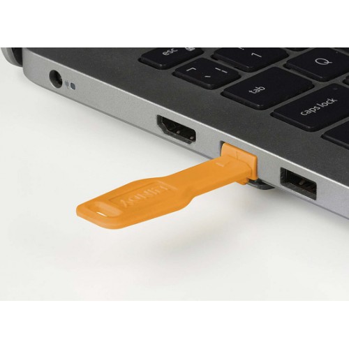 Die Anwendung ist also einfach: Setzen Sie das Schloss auf den Schlüssel und stecken es dann in den freien Port. Wenn Sie dann den Schlüssel herausziehen, verriegelt sich das Schloss im Port. Zum Entfernen stecken Sie den Schlüssel wieder in das Schloss zurück bis er einrastet und ziehen das Schloss heraus.