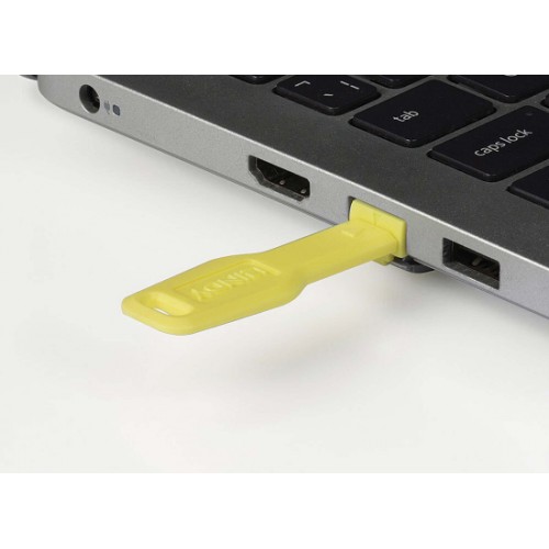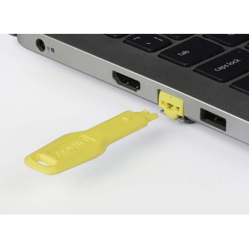Die Anwendung ist also einfach: Setzen Sie das Schloss auf den Schlüssel und stecken es dann in den freien Port. Wenn Sie dann den Schlüssel herausziehen, verriegelt sich das Schloss im Port. Zum Entfernen stecken Sie den Schlüssel wieder in das Schloss zurück bis er einrastet und ziehen das Schloss heraus.