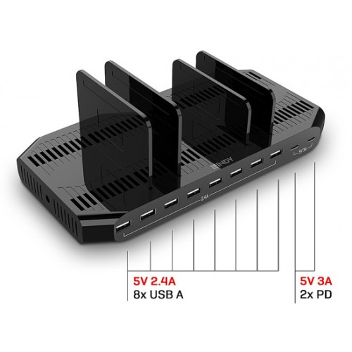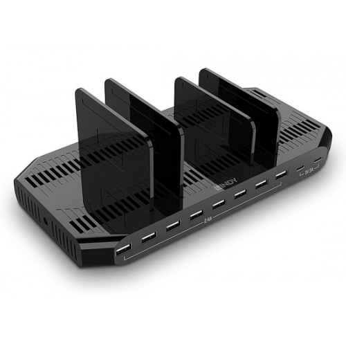 Die Lindy 120W 10 Port USB Ladestation erlaubt das Aufladen von bis zu 8 USB-Geräten via Typ-A-Anschluss und 2 via Typ-C-Anschluss wie Tablets oder Smartphones. Jeder USB Typ A Port kann bis zu 5V 2.4A liefern, jeder USB Typ C Port 5V 3A und auch den Bedarf stromhungriger Geräte decken. Bei gleichzeitiger Belegung aller 10 Ports oder wenn die Gesamtleistungsaufnahme mehr als 120W beträgt, erfolgt ein Lastausgleich. Mit ihrer intelligenten Ladefunktion ('Smart Charging') und der Unterstützung vieler verschiedener Protokolle wie QC 3.0 (nur Typ-C-Anschlüsse), Samsung AFC und Apple 5V 2.4A Charging Protocol und BC 1.2 (nur Typ-A-Anschlüsse) kann diese USB-Ladestation das angeschlossene Gerät erkennen und den Ladestrom automatisch anpassen, um ein schnelles und sicheres Aufladen zu ermöglichen. Gleichzeitig verfügt sie über einen Überstrom-, Überspannungs- und Kurzschlussschutz um zu verhindern, dass das Gerät beschädigt wird.