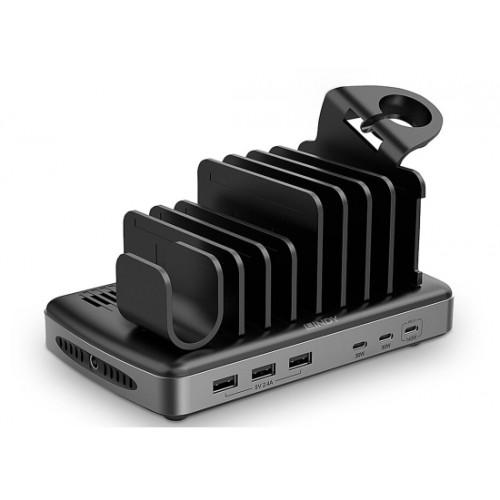 Die Lindy 160W 6 Port USB Ladestation erlaubt das Aufladen von bis zu 3 USB-Geräten via Typ-A-Anschluss und 3 via Typ-C-Anschluss wie Tablets, Smartphones, einem Laptop oder Macbook. Jeder USB Typ A Port kann bis zu 5V 2.4A liefern, zwei USB Typ C Ports jeweils bis 30W und einer bis zu 140W und auch den Bedarf stromhungriger Geräte decken. Bei gleichzeitiger Belegung aller 6 Ports oder wenn die Gesamtleistungsaufnahme mehr als 160W beträgt, erfolgt ein Lastausgleich.