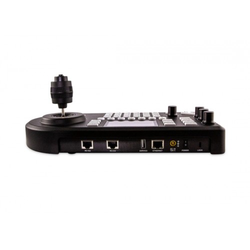 Der VS-PTC-300 ist ein Joystick-Controller für PTZ-Kameras. (NDI- und IP-fähige Block-Kameras kannst du auch darüber steuern. Also z.B. Weißabgleich vornehmen oder Fokus und Zoom anpassen.) An der Rückseite des Controllers befinden sich 3 RJ45-Buchsen. Je mit RS232-, RS422- und IP-Schnittstelle. Es ist möglich, die Kamera direkt mit einem Netzwerkkabel anzuschließen, oder - das ist der gängige Weg - sie über das Netzwerk zu steuern. Zwischen verschiedenen Kameras wechselst du bequem über die Kurzwahltasten am Controller. Die Tasten sind beleuchtet, sodass du auch im Dunkeln alles gut im Blick hast. Zur besseren Kameraführung ist der Zoom neben dem 4-D Joystick auch über eine Zoomwippe steuerbar. Das integrierte Display gibt dir die Möglichkeit, die Kamerafahrt live zu beobachten.