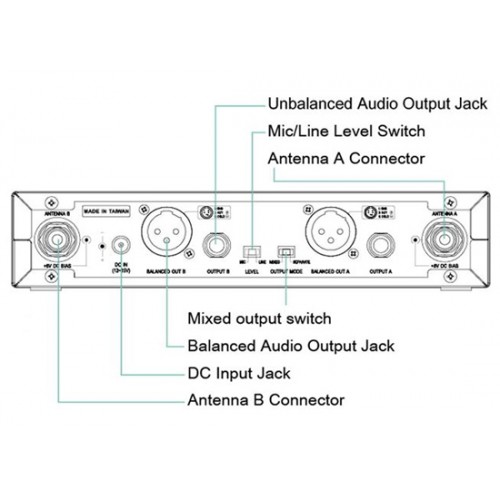 • Symmetrische XLR- und unsymmetrische 6,3 mm Klinke Audio-Ausgangsbuchse. Ausgangspegel Schalter (Mic/Line-Signal) sowie Einzel-/Summensignalschalter bei Mehrkanalempfänger