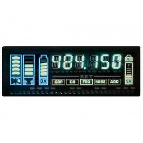 - Anzeige: Farbiges VFD zeigt Frequenz-Code, RF & Audio Pegel, Sender-Batterieanzeige, Diversity Signale, Interferenz-Warnanzeige. Programmierbare Benutzernamen, Gruppe, Kanal, Squelch-Level, PC-Adresse und Sperrstatus.