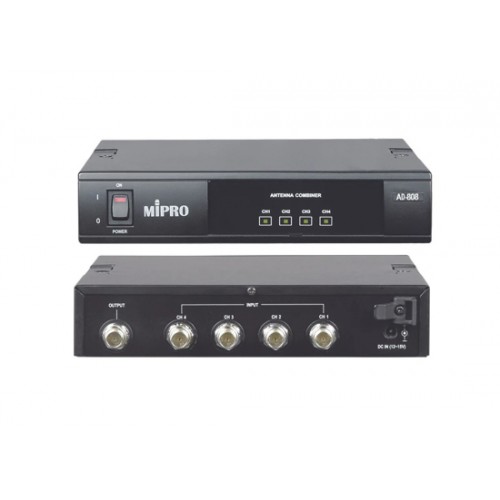 Mit dem aktiven 4-Kanal Antennencombiner AD-808 (4 in 1) können bis zu vier Sendeeinheiten über eine einzelne Sendeantenne betrieben werden (Einsatz bei In-Ear Systemen). Dadurch werden Intermodulationsverzerrungen, „Rauschen“ und Signalaussetzer reduziert. Im Lieferumfang sind die TNC-TNC Verbindungskabel enthalten.