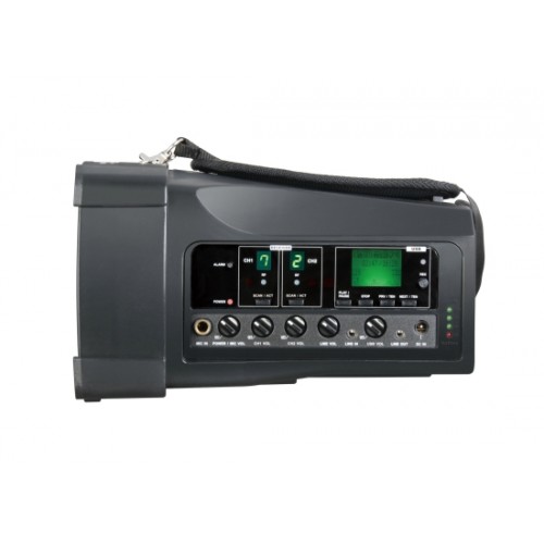 - Integrierter Zweikanalempfänger mit bis zu 16 einprogrammierten Frequenzen zuzüglich 6,3 mm Mic-In für den Anschluss von bis zu 3 Mikrofonen (2x drahtlos, 1x kabelgebunden).