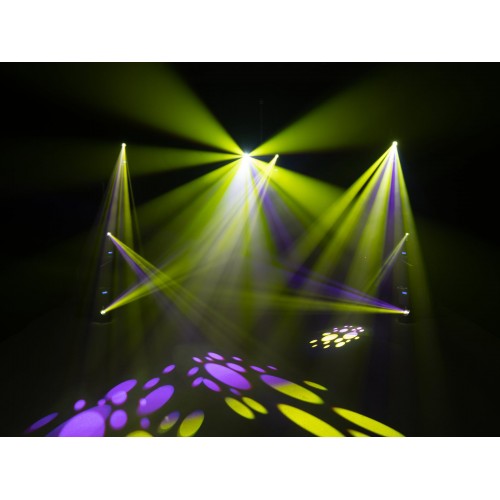 Scanner mit 100-W-LED, rotierenden Gobos, 3-Facetten-Prisma, Farbrad und MotorfokusHinweis: Die Makr..
