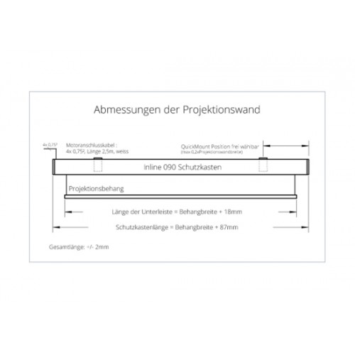 Ob als Standardgröße oder maßgefertigt – INLINE lässt die Projektionswand stilvoll verschwinden. Eine hochwertige, stationäre Projektionswand muss verschiedene Kriterien erfüllen. Ihre Bilder sollen groß, brillant und wirkungsvoll erscheinen – wird sie nicht benötigt, soll sie unsichtbar sein. Deshalb verschwindet beim System INLINE die Bildwandunterleiste im Kasten und schließt mit diesem Plan ab.