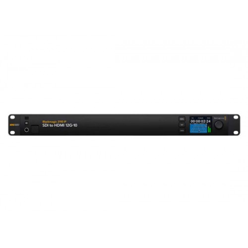 Der Blackmagic 2110 IP SDI to HDMI 12G-10 im Rackmount-Design wandelt 12G-SDI- oder SMPTE-2110-Video in HDMI. Du erhältst die hochwertigsten Konvertierungen zwischen allen SD-, HD- und Ultra-HD-Videonormen mit 3D-LUTs für die genaue Kalibrierung von HDMI-Bildschirmen. Der Blackmagic 2110 IP SDI to HDMI 12G-10 verfügt über 10 unabhängige XLR-Audioausgänge mit Pegelfernsteuerung und anpassbarer Verzögerung für die Synchronisation mit Fernsehern und Projektoren. An der Frontblende verfügt er über ein LCD mit Videoanzeige, Pegelmetern und Menüs sowie einen Lautsprecher- und Kopfhöreranschluss.