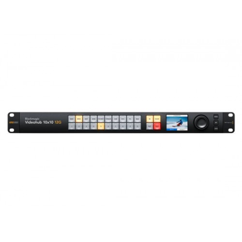 Die Blackmagic Videohub 10x10 12G ist eine fortschrittliche latenzfreie 12G-Kreuzschiene für 10 x 10 simultane Ein- und Ausgaben von beliebig kombinierten SD-, HD- und Ultra-HD-Videosignalen auf derselben Kreuzschiene. Sie verfügt über zehn 12G-SDI-Eingänge, zehn 12G-SDI-Ausgänge plus Referenzanschlüsse und passt in eine Rack-Einheit. Auf dem Frontblenden-LCD sichten Sie Video vor dem Routing. Auch kann man dort Routing-Labels und Videonormen deutlich ablesen. Die Signalverteilung lässt sich direkt per Tastendruck oder mithilfe des großen Drehreglers vorgeben, der mit einer elektronischen Kupplung ausgestattet ist. Neben SDI-Reclocking und externer Steuerung per Ethernet werden alle SDI-Videonormen bis 2160p/60 unterstützt.