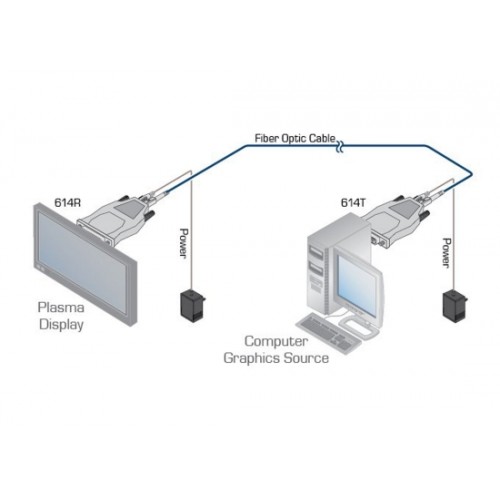 614T und 614R sind ein kleines und leichtes optisches Übertrager−/Empfänger−Paar zur Übertragung von DVI−Signalen über ein steckbares LWL−Kabel. Sie übertragen unkomprimiertes DVI mit Auflösungen bis 1920x1200/60 Hz über ein einzelnes Multimode LWL−Kabel mit SC−Steckern. Der Übertrager 614T wandelt das DVI−Signal in ein optisches Signal, das zum Empfänger 614R übertragen wird, der das optische Signal zurück in DVI wandelt.