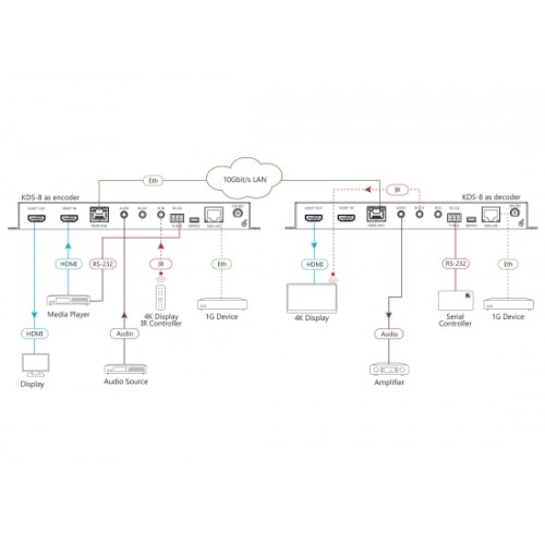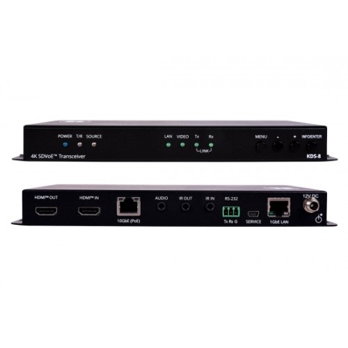 KDS−8 ist ein leistungsstarker, latenzfreier 4K@60Hz (4:4:4:4) Video−Streaming−Transceiver für das Streaming via Ethernet über Kupferkabel. Der KDS−8 kann entweder als Encoder oder Decoder eingestellt werden. Als Encoder kodiert und streamt er den HDMI−Eingang sowie IR−, RS−232− und Analog−Audio über ein IP−Netzwerk. Als Decoder empfängt er das kodierte Signal und dekodiert es zur Ausgabe.