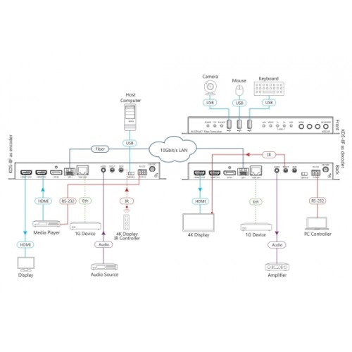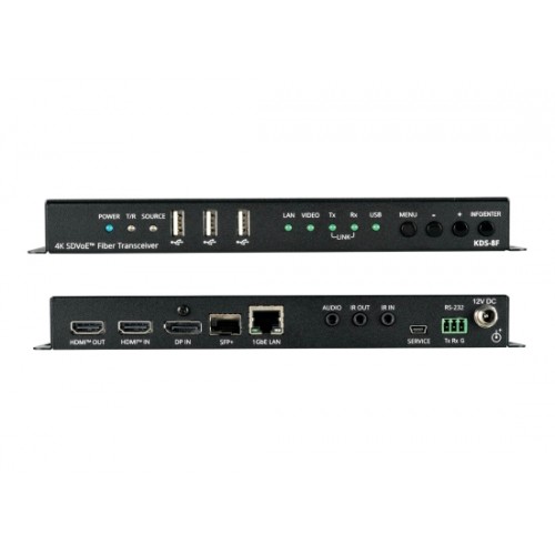 KDS−8F ist ein leistungsstarker, latenzfreier 4K@60Hz (4:4:4:4) Video−Streaming−Transceiver für das Streaming über Ethernet Singlemode− und Multimode−Lichtwellenleiter. Der KDS−8F kann entweder als Encoder oder Decoder eingestellt werden. Als Encoder kodiert und streamt er den HDMI− oder DisplayPort−Eingang sowie IR, RS−232, analoges Audio und USB über ein IP−Netzwerk. Als Decoder empfängt er das kodierte Signal und dekodiert es zur Ausgabe.