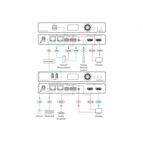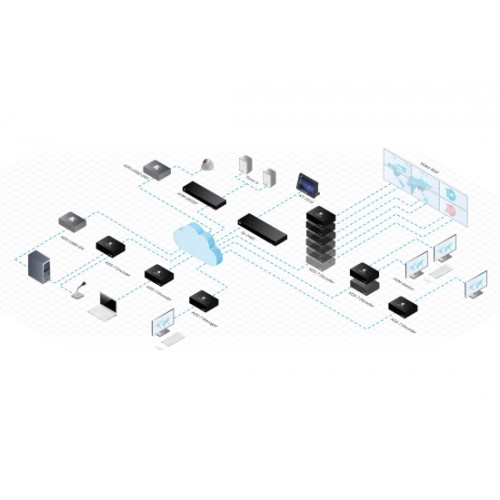 Der KDS-DEC7 Decoder ist ein fortschrittlicher Empfänger zum Streamen von 4K@60Hz (4:2:0) Videosignalen über Ethernet über Kupferkabel. Es dekodiert Streams über ein IP-Netzwerk zum HDMI-Ausgang und überträgt das USB-, IR-, RS232- oder CEC-Signal über das IP-Netzwerk.