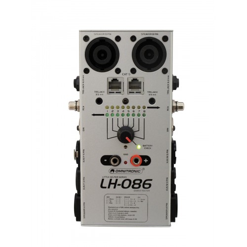 Der OMNITRONIC LH-086 überprüft die Funktion von 3 und 5-poligen XLR-, 3,5/6,3-mm-Klinken- (auch Stereo), CAT5, DIN-, Cinch- und 4 sowie 8-poligen Speaker-Kabeln und Steckverbindungen. Zur einfacheren Kontrolle lässt sich die Polarität bzw. vorhandene Kurzschlüsse an einer Anzeige ablesen. Auch der Test des Durchgangssignals ist über zwei Bananenbuchsen möglich.Kabeltester für XLR, Klinke, CAT5, DIN, Cinch, Speaker