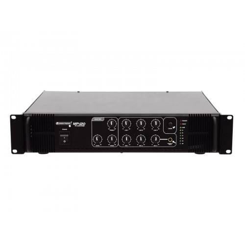 Hohe Zuverlässigkeit bei maximaler Flexibilität Der Omnitronic MP-120 ELA-Mischverstärker ist Ihr verlässlicher Partner bei der Arbeit mit ELA-Beschallungsanlagen. Er ist dank seines 19"-Formats sowohl für den Mobilbetrieb als auch für Festinstallationen bestens geeignet. Ausgänge für ELA-Lautsprecher mit 70-V- und 100-V-Audioübertrager oder 4-16-Ohm-Lautsprecher lassen keine Wünsche offen. Darüber hinaus können Sie am Line-Output auch ein Gerät mit Line-Pegel (z.B. Mischpult) anschließen. Mit 6 mischbaren Eingängen sind Sie stets flexibel. Schließen Sie bis zu 3 Mikrofone und 3 Geräte mit Line-Pegel an. Durchsagen haben PrioritätDer frontseitig angeordnete Mikrofoneingang 3 verfügt über eine regelbare Prioritätsschaltung. Sie ermöglicht Ihnen, wichtige Durchsagen bei automatischer, stufenlos einstellbarer Pegelabsenkung sämtlicher Signale zu machen. Weisen sie mit Hilfe des Gongs zusätzlich auf Ihre Durchsage hin. Schutzfunktionen Ein Lüfter schützt das Innenleben Ihres MP-120 vor Überhitzung. Neben einer Einschaltverzögerung verfügt er über Schutzschaltungen gegen Überspannung und Kurzschluss. In diesen Fällen werden Ihre Lautsprecher elektrisch vom Verstärker getrennt. Die LED FAULT leuchtet dann auf und sowohl der MP-120 als auch Ihre Lautsprecher sind vor Beschädigung geschützt.ELA-Mischverstärker, 120 W RMS