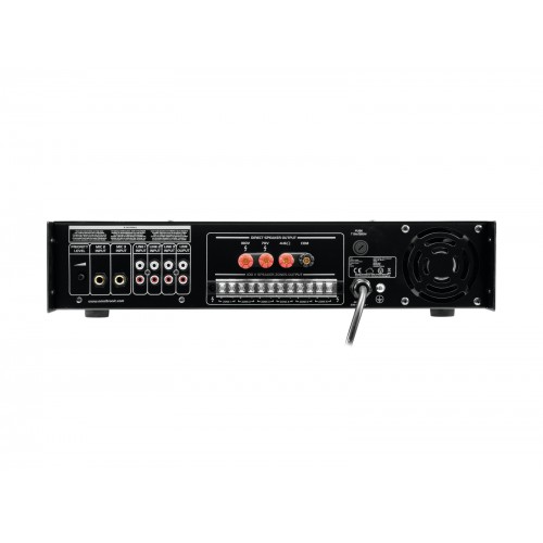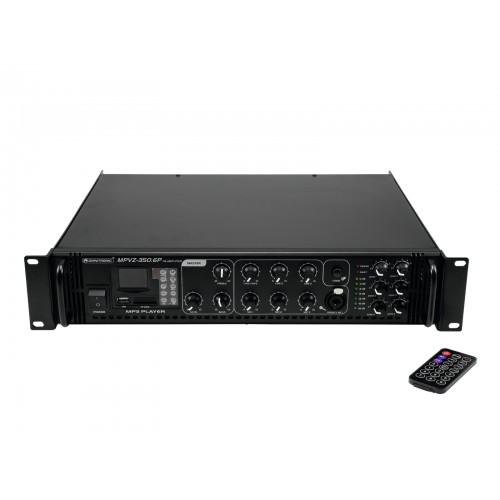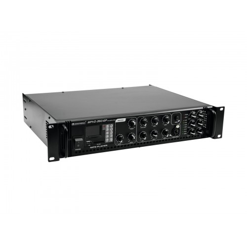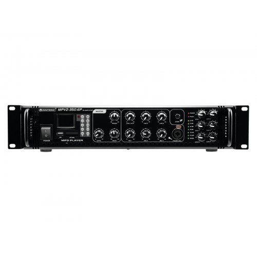 Enorme Zuverlässigkeit bei maximaler FlexibilitätDer Omnitronic MPVZ-350.6P ELA-Mischverstärker ist Ihr verlässlicher Partner in Sachen ELA-Beschallungsanlagen. Er ist dank seines 19"-Formats sowohl für den Mobilbetrieb als auch für Festinstallationen bestens geeignet. Ausgänge für ELA-Lautsprecher mit 70-V- und 100-V-Audioübertrager oder 4-16- Ohm -Lautsprecher lassen keine Wünsche offen. Darüber hinaus können Sie am Line-Output auch ein Gerät mit Line-Pegel (z.B. Mischpult) anschließen. Mit 6 mischbaren Eingängen sind Sie stets flexibel. Schließen Sie bis zu 3 Mikrofone und 3 Geräte mit Line-Pegel an. Steuern Sie Ihre ELA-Lautsprecher besonders komfortabel über die 6 Zonenausgänge des MPVZ-350.6P an. Sie sind auf der Frontplatte jeweils mit einem 5-stufigen Lautstärkesteller separat regelbar. Das bedeutet für Sie: Größtmögliche Anpassungsfähigkeit bei der Realisierung Ihres Beschallungskonzepts.Der MPZ-350.6P bietet Ihnen darüber hinaus einen MP3-Player mit Infrarot-Fernbedienung und blau hinterleuchteter LCD-Anzeige. Er weist sowohl einen SD-Kartensteckplatz als auch einen USB-Anschluss auf. So spielen Sie spontan und flexibel Musiktitel von einem Speichermedium Ihrer Wahl ein.Verschaffen Sie sich Gehör! Der frontseitig angeordnete Mikrofoneingang 3 verfügt über eine regelbare Prioritätsschaltung. Sie ermöglicht Ihnen wichtige Durchsagen bei automatischer, stufenlos einstellbarer Pegelabsenkung sämtlicher Signale. Weisen Sie mithilfe des Gongs zusätzlich auf Ihre Durchsage hin. SchutzfunktionenEin Lüfter schützt das Innenleben Ihres MPVZ-350.6P vor Überhitzung. Neben einer Einschaltverzögerung verfügt er über Schutzschaltungen gegen Überspannung und Kurzschluss. In diesen Fällen werden Ihre Lautsprecher elektrisch vom Verstärker getrennt. Sowohl der MPVZ-350.6P als auch Ihre Lautsprecher sind so vor Beschädigungen geschützt.6-Zonen-ELA-Mischverstärker mit Audioplayer und IR-Fernbedienung, regelbare Zonen, 350 W RMS
