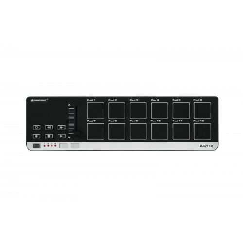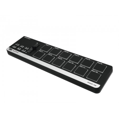 - 12 hintergrundbeleuchtete, anschlagdynamische Drumpads zum Senden von Notendaten, MIDI CC oder Programmwechseln