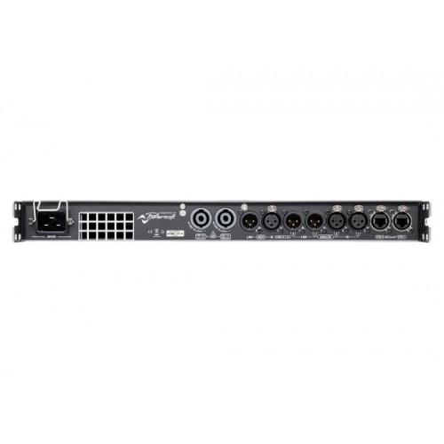 - Steuerung über das Display an der Frontplatte für Funktionen wie Preset-Recall (auch pro Ausgang), Gain, Delay, Mute. Das macht die Bedienung für kleine Systeme in einem Verleihbetrieb sehr einfach. Das Display zeigt auch den verfügbaren Headroom mit leicht ablesbaren Zahlen in dB sowie weitere Parameter zur Statusüberwachung an