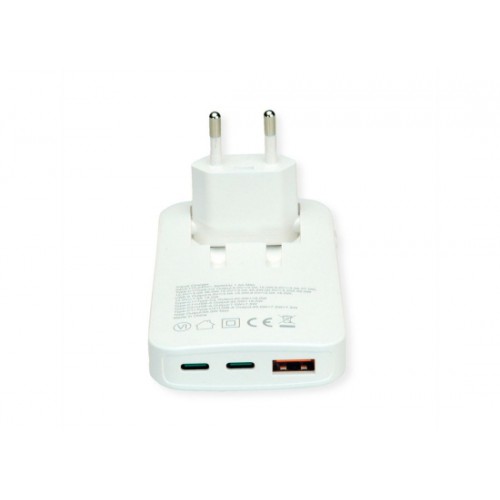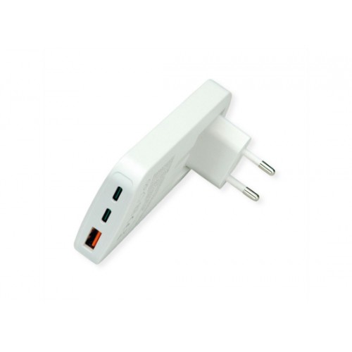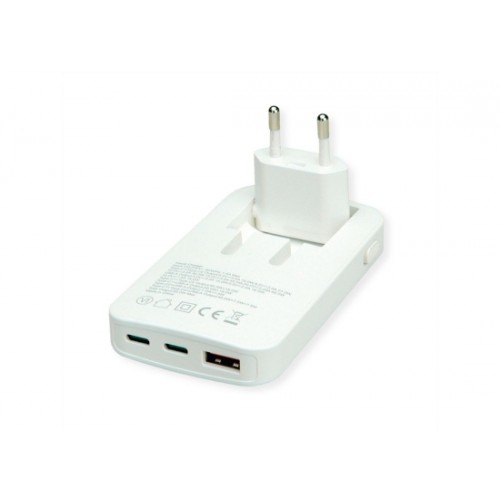 Ladegerät für mobile Geräte, z.B. Smartphones oder Tablets, mit USB-Ports (2x Typ C, 1x Typ A) - dank schlankem Design und klappbarem Euro-Stecker ideal zum Mitnehmen.