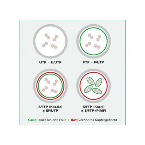 - Aufbau: 8 Adern Litze, paarweise Schirmung in aluminiumkaschierter Folie