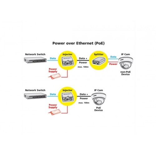 Der ROLINE Gigabit PoE Injektor ist ein sogenanntes PSE, ein Gerät zur Stromversorgung für z.B. Überwachungskameras und LAN-Geräte wie Access Points, Bridges und Router über Ethernet-Kabel. Ein PSE speist Strom zu den Daten in das Netzwerkkabel ein. Es muss dann kein eigenes Netzteil mehr an dem LAN-Gerät angeschlossen werden.