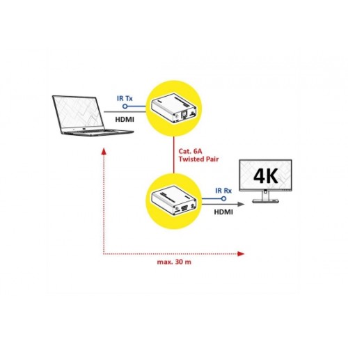 Die Audio- / Videoübertragung erfolgt über HDMI und Kat.6A-Kabel. Es werden bis zu 4k (3840x2160) @60Hz bei einer Strecke von bis zu 30m erreicht. Bei längerer Entfernung von bis zu 45m wird die Auflösung auf Full HD (1920x1080) @60Hz gedrosselt.
