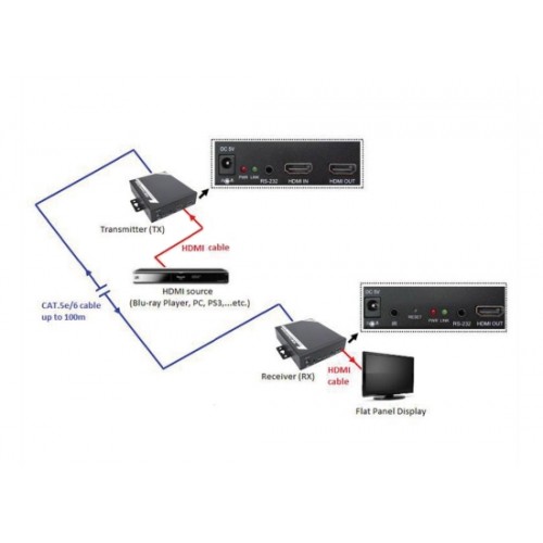 - Die Reichweite des HDMI Signals kann mit Hilfe der HDMI Verlängerung und eines Kat.5e oder Kat.6 Kabels um bis zu 100 m verlängert werden