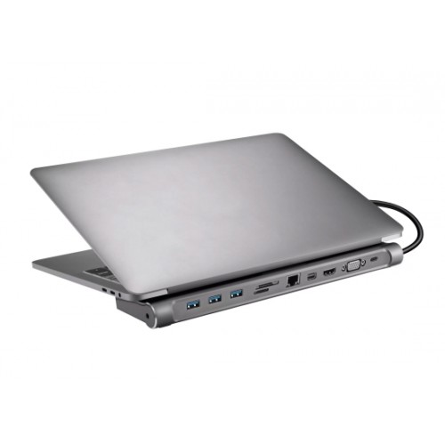- Ausgänge: 1x USB C female (unterstützt bis zu 87 W), 1x HDMI female, 1x Mini-DisplayPort female, 1x VGA female, 3x USB 3.0 A female, 1x RJ45 female, 1x Audio-Ausgang, 1x Loch für Sicherheitsschloss, 1x SD-Kartenleser-Slot für SD/SDHC/SDXC/MMC