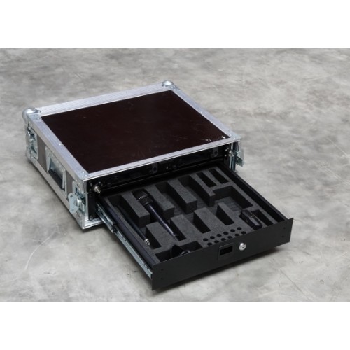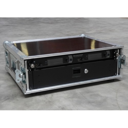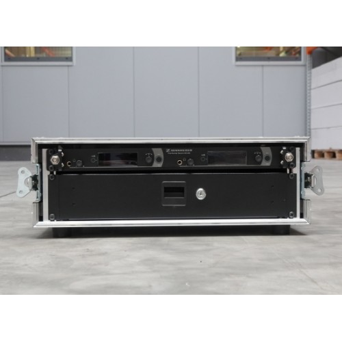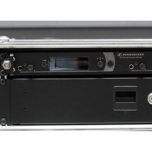 3HE Rack mit eingebautem EM 2050 G3 Doppelempfänger und SKM 965 G3 Handsender sowie SK 2000 G3 Taschensender in einer Rackschublade.
