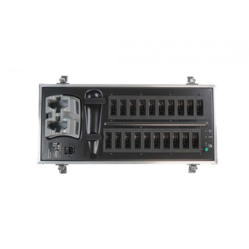 20 Ladeschächte für die Kinnbügelhörer und zwei Ladeschächte für den Taschensender und dessen Akku stellt der Sennheiser Tour Guide EZL 2020-20L Ladekoffer zur Verfügung.
