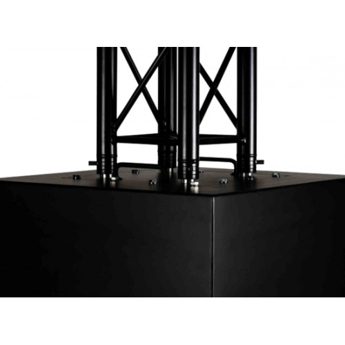 Es besteht aus einem langlebigen Stahlbehälter, der mit festem Beton gefüllt ist, und bietet eine zuverlässige Stütze sowohl für Innen- als auch für Außenaufbauten. Mit seiner kompakten Grundfläche und der mattschwarzen Oberfläche fügt er sich nahtlos in professionelle Bühnen-, Event- und Ausstellungsumgebungen ein.