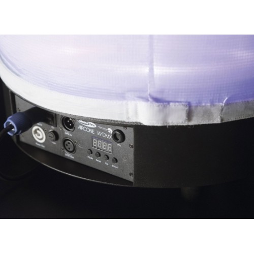 Auch der Ventilator wird über DMX gesteuert. Das ermöglicht es Ihnen mit weniger Umdrehungen die Ventilatorgeräusche zu reduzieren und mit einer erhöhten Drehzahl den Aircone auch draußen (Wind!) oder in abweichende Positionen zu stabilisieren.